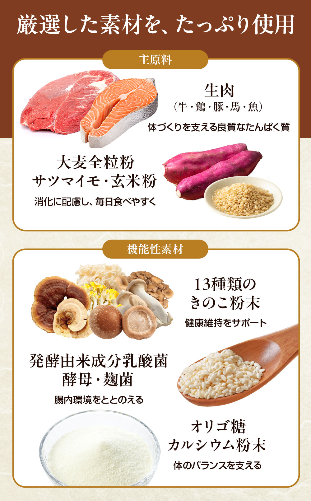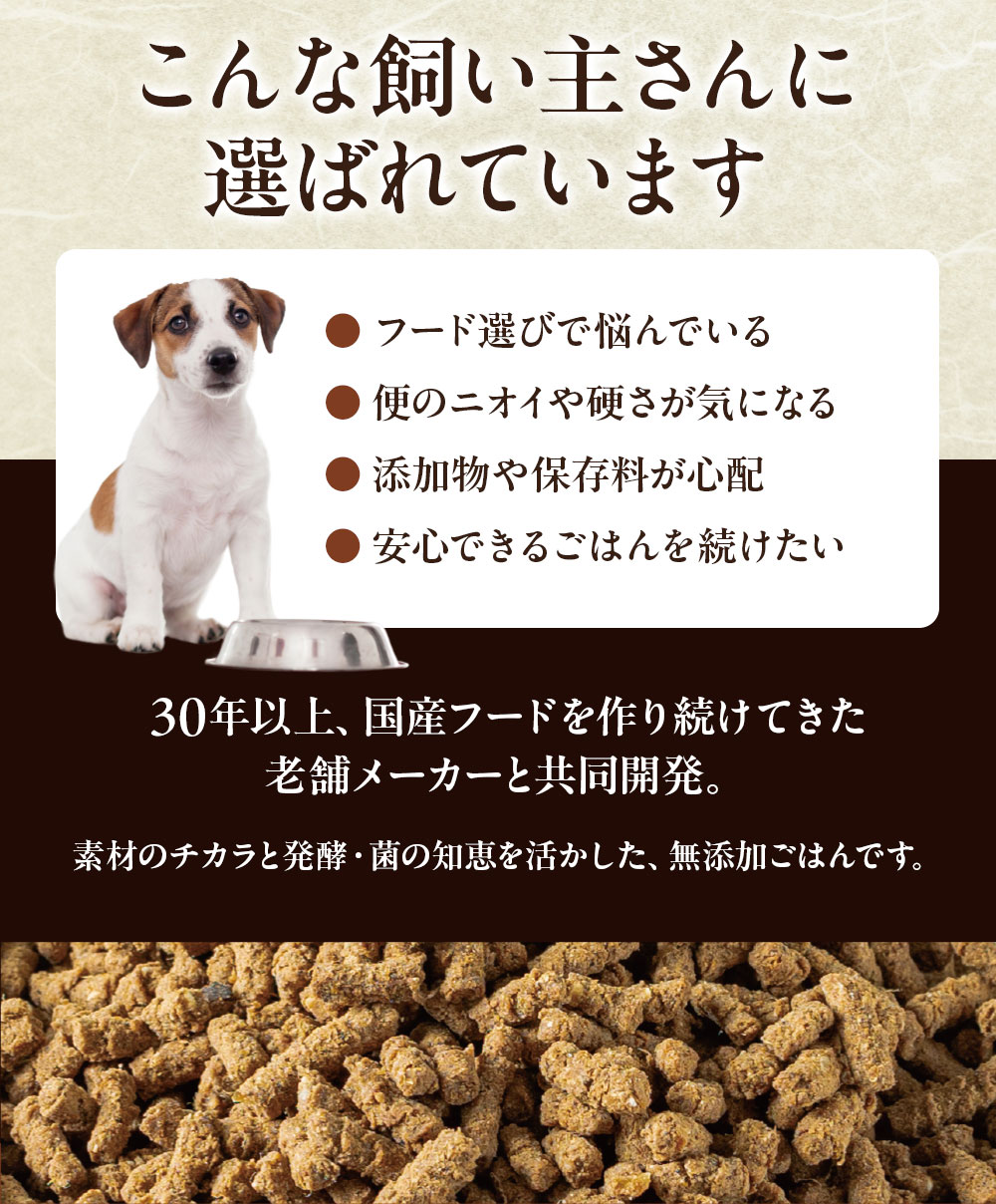 素材のチカラと発酵・菌の知恵を活かした、無添加ペットフードです。