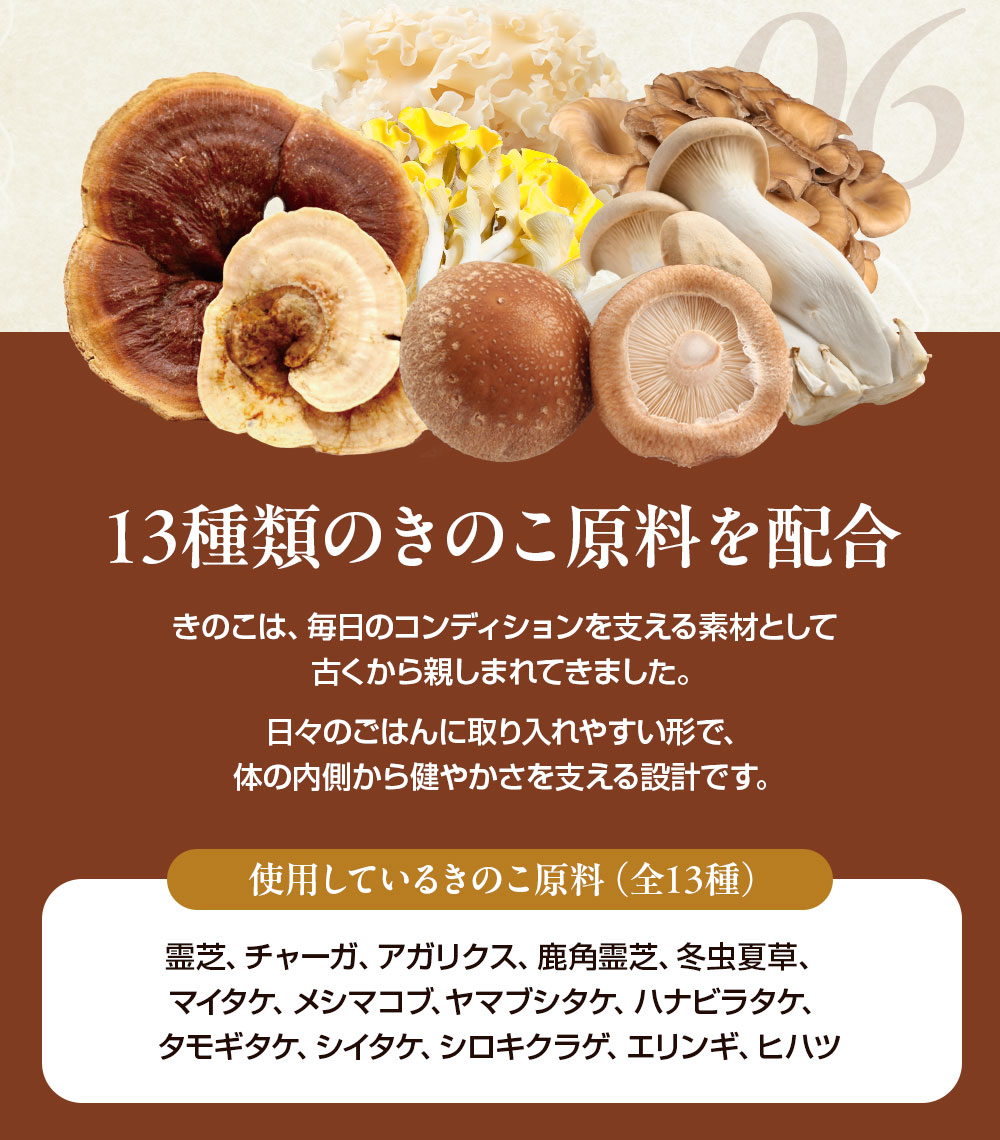 蛋白、ビール酵母、脱脂粉乳、海藻粉末、キノコ粉末(霊芝、チャーガ、アガリクス、鹿角霊芝、冬虫夏草、マイタケ、メシマコブ、ヤマブシタケ、ハナビラタケ、タモギタケ、シイタケ、シロキクラゲ、エリンギ)、ヒハツ、米ぬかエキス、オリゴ糖、カルシウム粉末、L-リジン、DL-メチオニン、ローズマリー抽出物、乳酸菌群、酵母菌発酵抽出物、麹菌発酵抽出物、枯草菌
